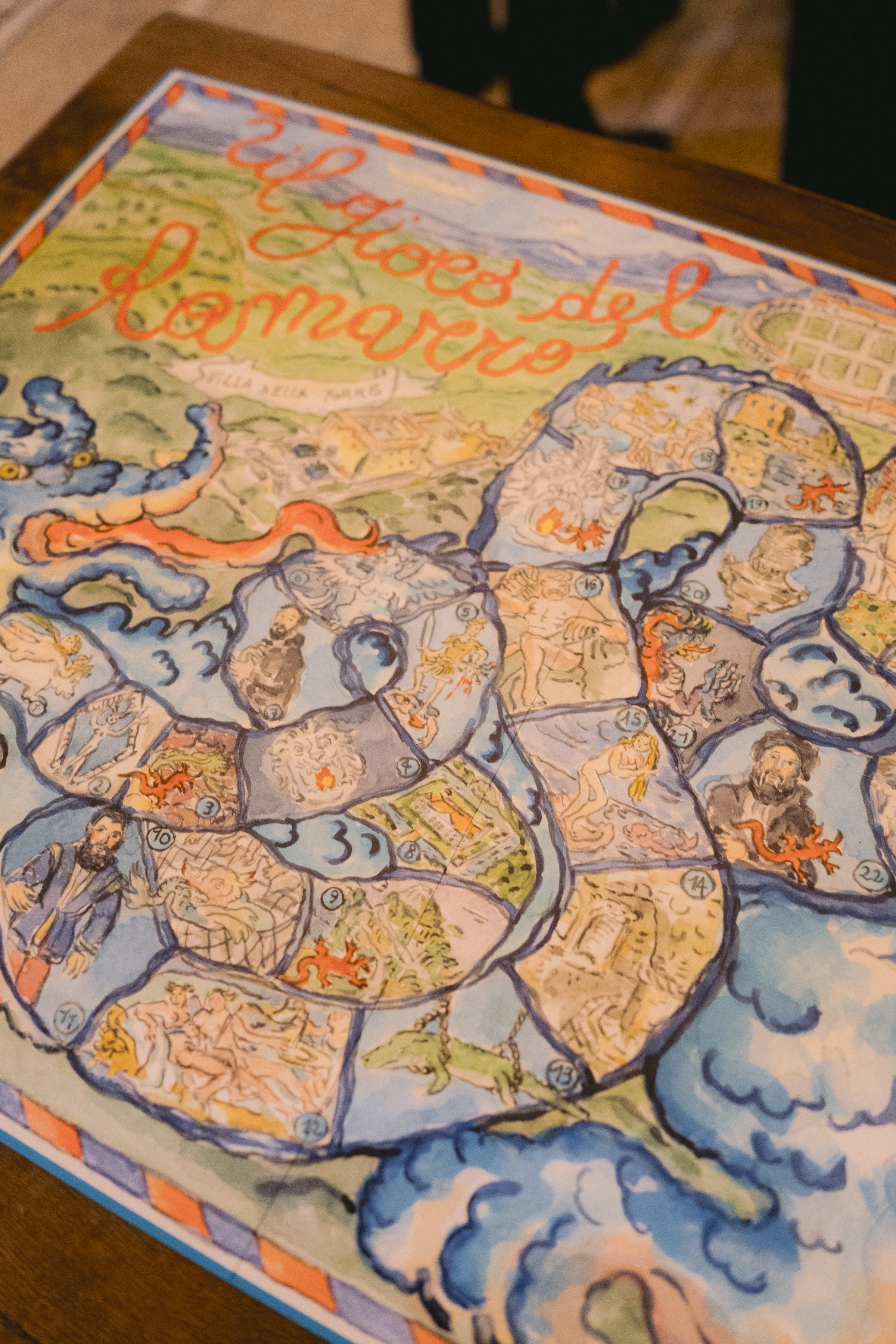 La seconda novità è un progetto artistico ideato con l’intento di legare ancora più profondamente i due luoghi. Si è deciso di chiedere all’artista Flaminia Veronesi di creare un gioco da tavola che ricreasse e attraversasse simbolicamente Palazzo Te e Villa Della Torre. È nato così il “Gioco del Ramarro” che, riprendendo la struttura tipica del gioco dell’Oca, conduce i partecipanti da un luogo all’altro. Il nome del gioco è intrinsecamente legato alla storia di Palazzo Te, il Ramarro infatti compare ripetutamente nelle sale del Palazzo ed è il simbolo scelto da Federico II Gonzaga per nascondere un messaggio segreto legato al tormento amoroso.