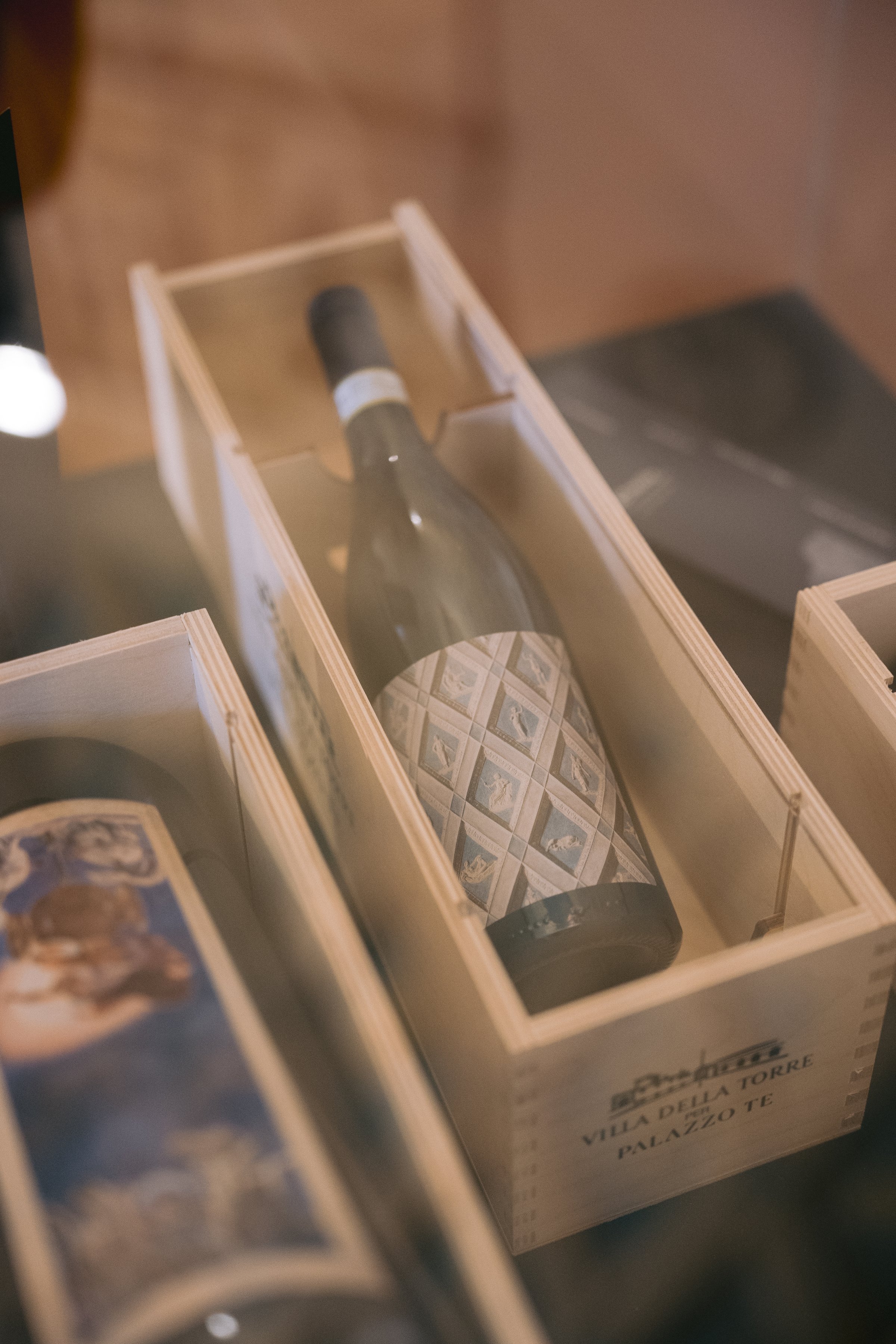 Due le etichette da collezione che differenziano la limited edition: la prima, che caratterizza la bottiglia da 0,75L, riporta una sezione della volta del soffitto della Camera del Sole e della Luna. Le vele della volta di questa stanza sono decorate a lacunari (192 tra losanghe e triangoli ai bordi della composizione) con rilievi di stucco, su fondo celeste, raffiguranti uomini, animali, emblemi. La seconda, che caratterizza i grandi formati (1,5L e 3L), riporta in etichetta il meraviglioso affresco che si trova sulla volta centrale dell’omonima stanza, con l’allegoria del carro del Sole al tramonto e quello della Luna che spunta, metafora del trascorrere incessante del tempo. Una lunga tradizione vuole che l’affresco sia stato eseguito dal più brillante allievo di Giulio Romano: il bolognese Francesco Primaticcio.